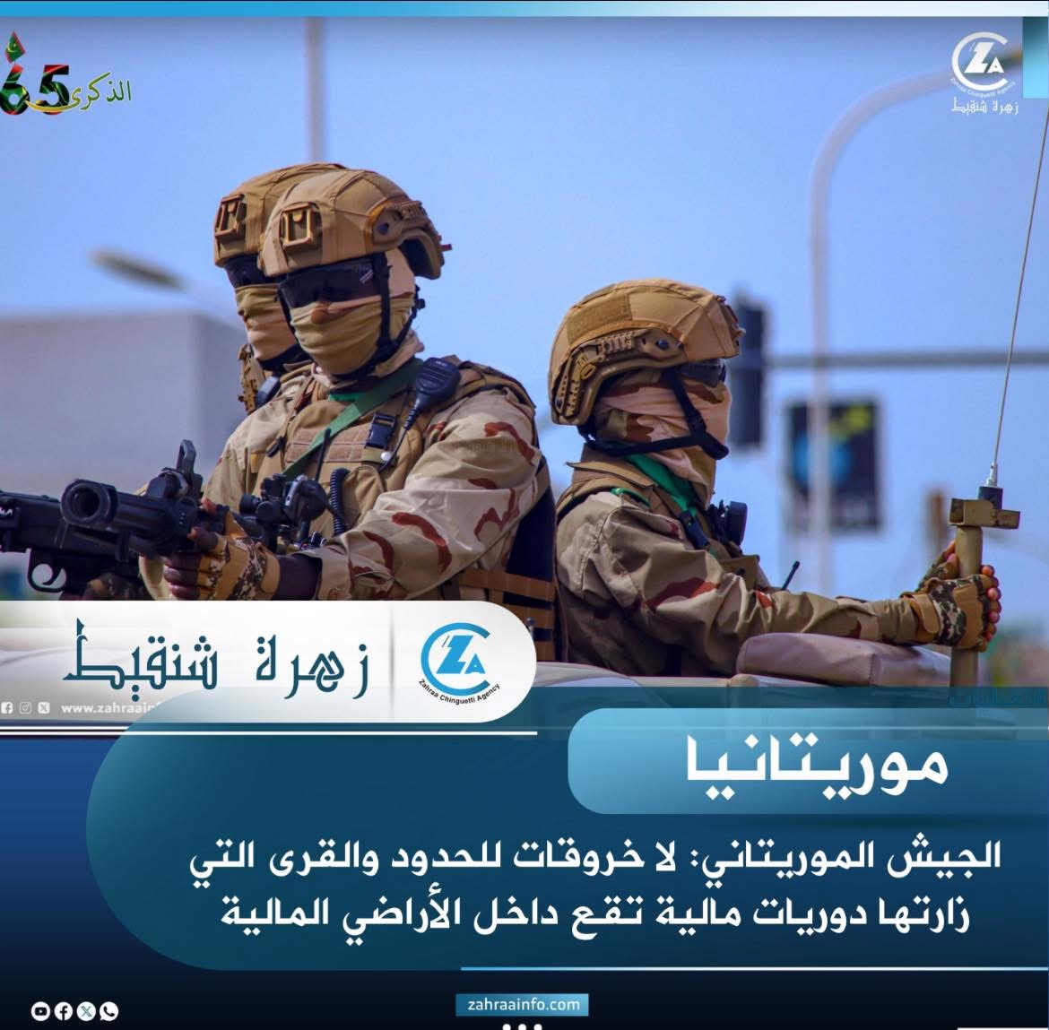 قال الجيش الوطني الموريتاني إن ما تم تداوله حول دخول دوريات من القوات المالية إلى قرى داخل التراب الموريتاني غير صحيح، مؤكدًا أن القرى المعنية تقع داخل الأراضي المالية وعلى مسافات مختلفة من الحدود الوطنية.