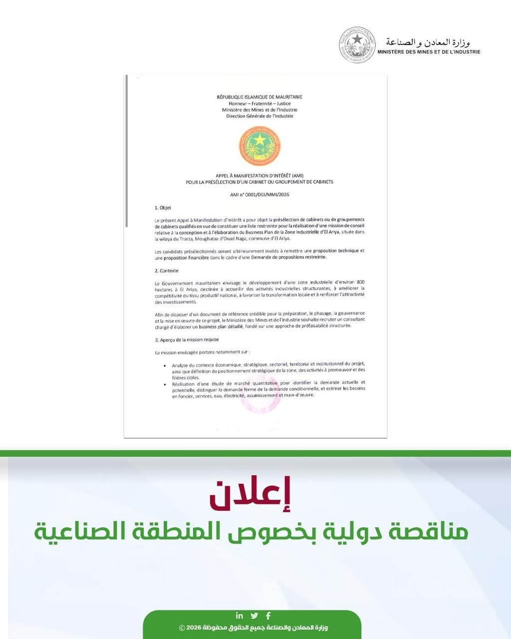 دعت وزارة المعادن والصناعة، ممثلة في المديرية العامة للمعادن والجيولوجيا، كافة الشركات الحاصلة على رخص البحث إلى الالتزام بإيداع تقارير أنشطة البحث المنجزة، وفقاً للتعليمات الصادرة والمقتضيات القانونية والتنظيمية المعمو