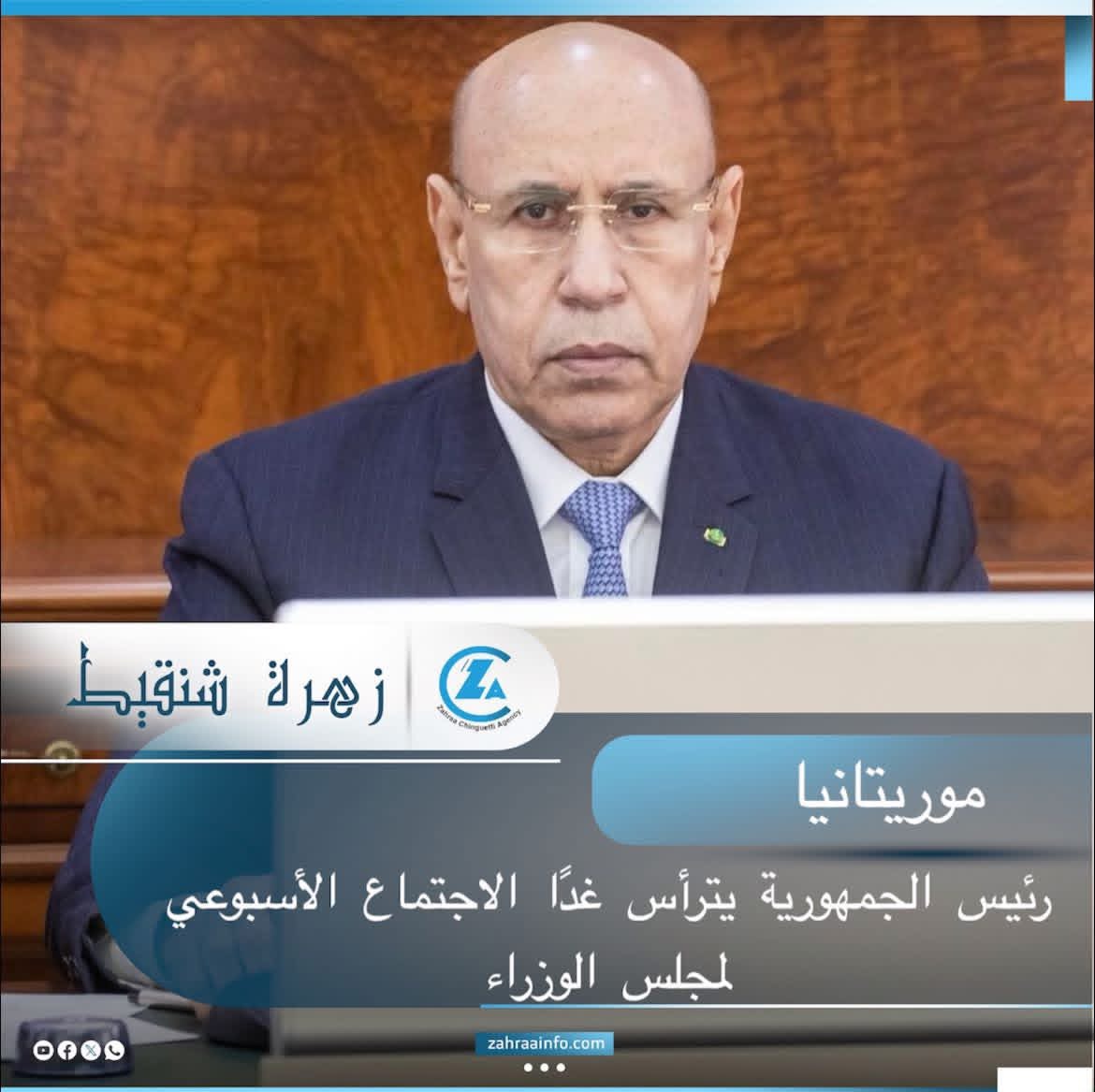 من المقرر أن يترأس رئيس الجمهورية، محمد ولد الشيخ الغزواني، صباح غدٍ الأربعاء، الموافق 1 أكتوبر 2025، عند الساعة العاشرة، الاجتماع الأسبوعي لمجلس الوزراء بالقصر الرئاسي في نواكشوط.