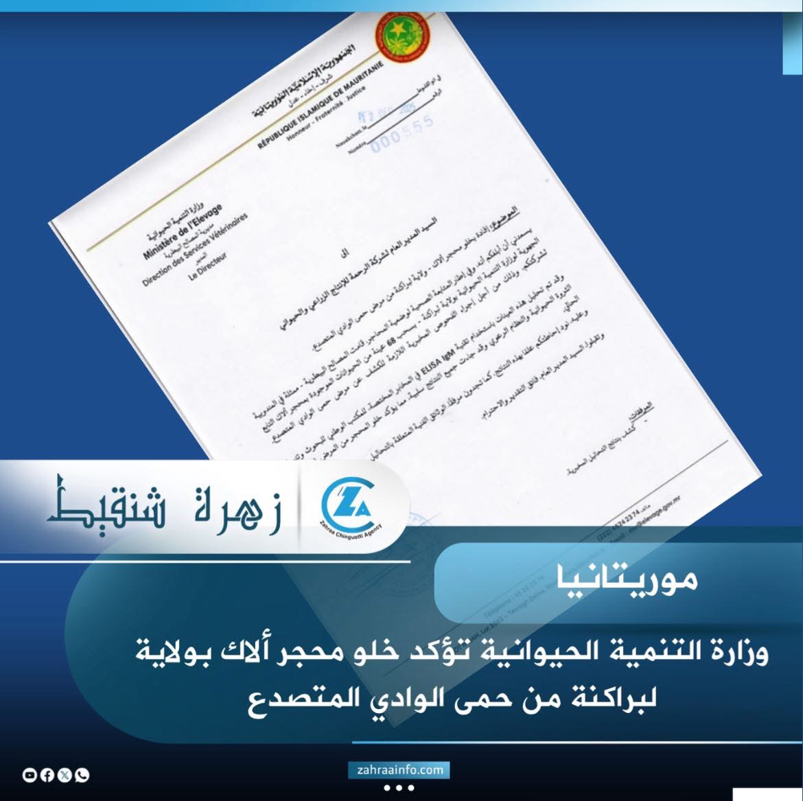 أعلنت اليوم الاثنين 15/12/2025 إدارة المصالح البيطرية بوزارة التنمية الحيوانية عن خلو محجر ألاك، التابع لشركة الرحمة للإنتاج الزراعي والحيواني بولاية لبراكنة، من مرض حمى الوادي المتصدع ، وذلك في إطار المتابعة الصحية لل