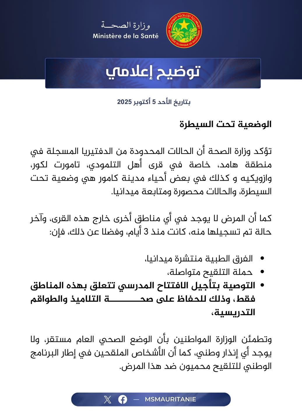 تؤكد وزارة الصحة أن الحالات المحدودة من الدفتيريا المسجلة في منطقة هامد، خاصة في قرى أهل التلمودي، تامورت لكور، وازويكيه و كذلك في بعض أحياء مدينة كامور هي وضعية تحت السيطرة، والحالات محصورة ومتابعة ميدانيا.
