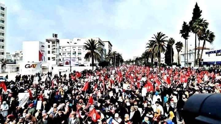 شارك الآلاف من أنصار حركة النهضة بتونس فى مسيرة جماهيرية اليوم السبت 27 فبراير 2021 بالعاصمة تونس، تحت شعار " الثبات والدفاع عن المؤسسات" ، وسط حراك متصاعد فى تونس منذ اندلاع الأزمة الحكومية قبل شهرين.