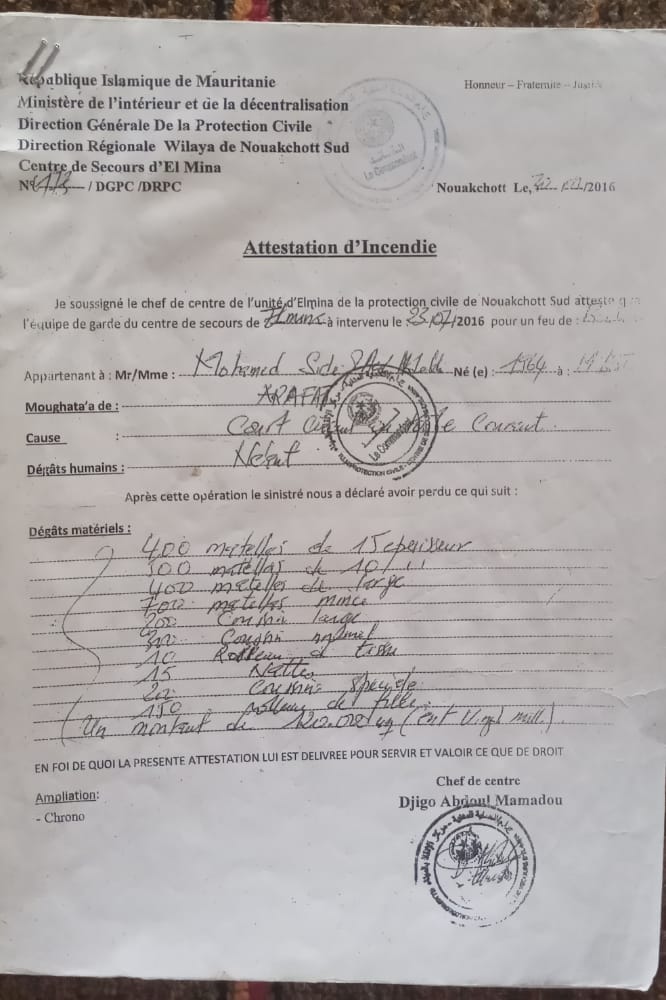 وهذه الرسالة مرفقة بنسخة مصدقة من إفادة الحريق موقعة من طرف الحماية المدنية . وجزاكم الله خيرا عن المسلمين والمظلومين ووفقنا الله وإياكم لما يحب ويرضى ..