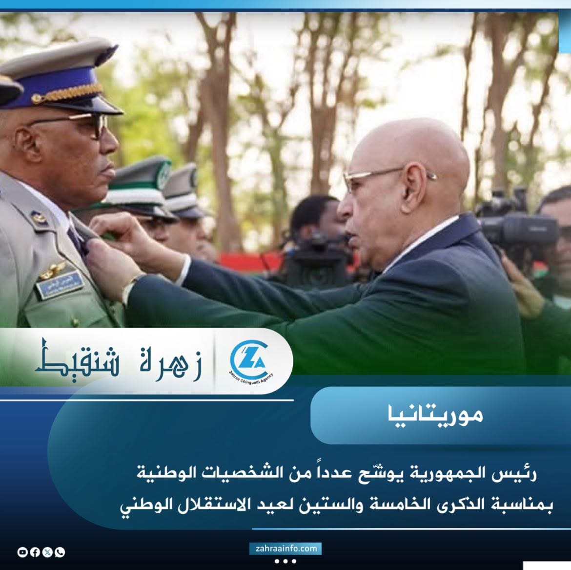 وشّح رئيس الجمهورية محمد ولد الشيخ الغزواني، بمناسبة الذكرى الـ65 لعيد الاستقلال الوطني، عدداً من الشخصيات الوطنية من مختلف القطاعات العسكرية والأمنية والمدنية، تقديرا لإسهاماتهم المتميزة وخدمتهم للوطن .