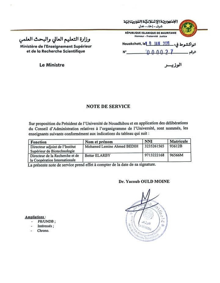 وبموجب المذكرة الجديدة، فقد تم تعيين الدكتور بتار ولد العربى مديرا للبحث والتعاون الدولى بجامعة نواذيبو.