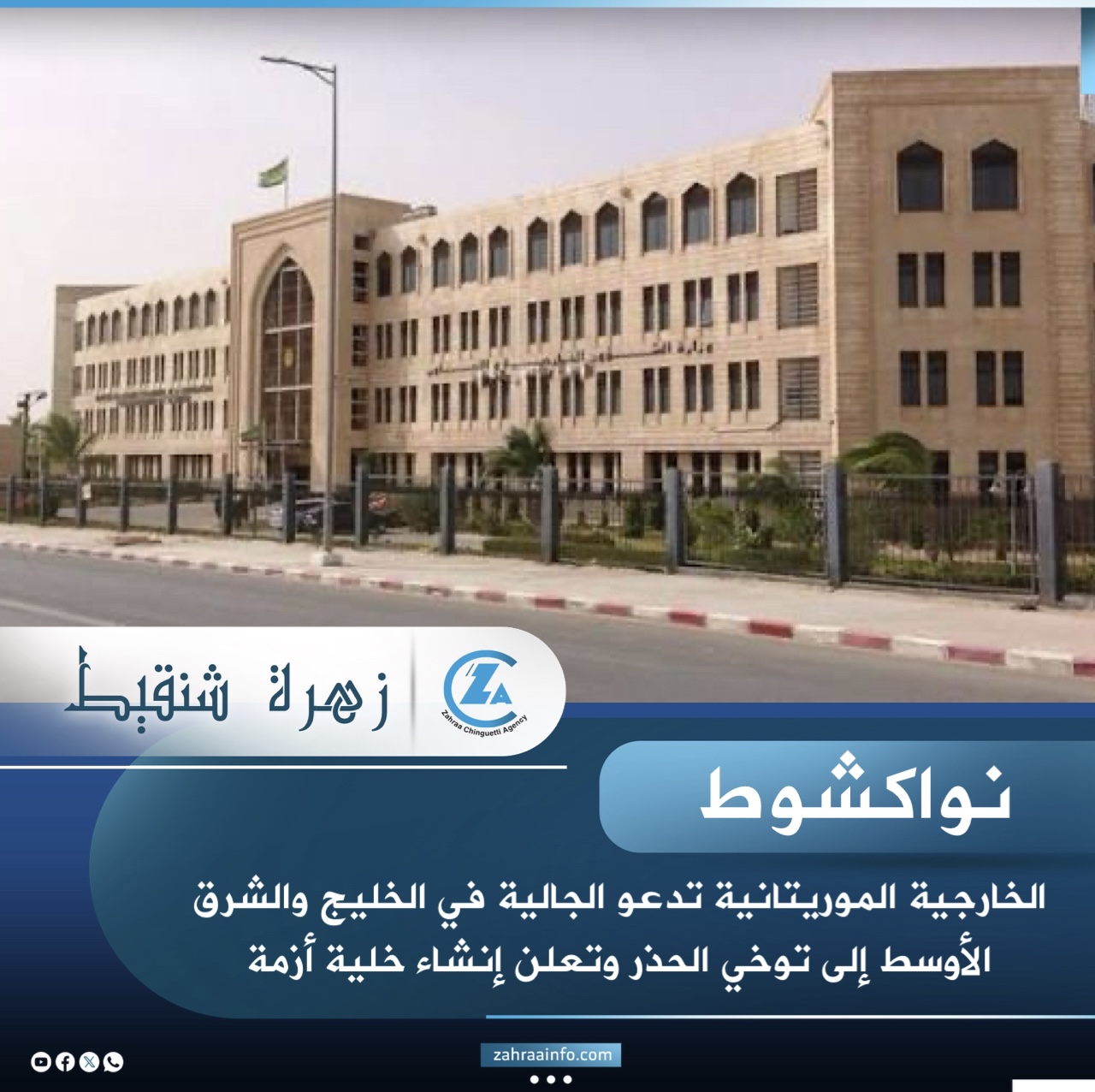 دعت وزارة الشؤون الخارجية والتعاون الإفريقي والموريتانيين في الخارج أفراد الجالية الموريتانية المقيمين في منطقة الخليج العربي والشرق الأوسط إلى توخي أقصى درجات الحيطة والحذر، وذلك على خلفية التصعيد الذي تشهده المنطقة.