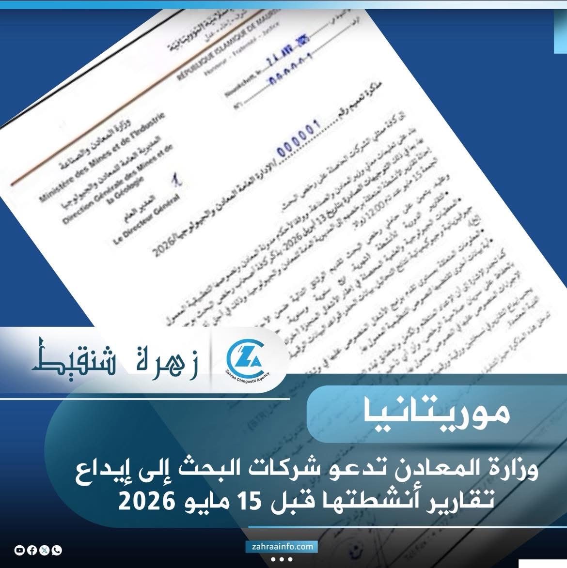 وحددت الوزارة يوم الجمعة 15 مايو 2026 عند الساعة 12:00 زوالاً كآخر أجل لإيداع هذه التقارير، مؤكدة أن العملية تشمل التقارير الدورية الشهرية والربع سنوية والسنوية حسب نوع الرخصة، إضافة إلى المعطيات الجيولوجية والعلمية الناتجة عن الأشغال المنجزة، بما في ذلك الخرائط الجيولوجية، ونتائج المسوحات الجيوفيزيائية والجيوكيميائية، والتحاليل المخبرية، وقواعد البيانات الرقمية، والتقارير الفنية المفصلة.