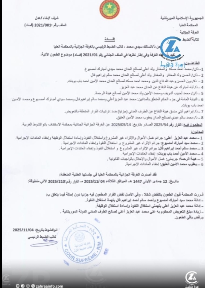 2025، أصدرت الغرفة الجزائية، بالمحكمة العليا قرارها النهائي في الملف الجنائي رقم 2021/01، المعروف إعلاميًا بملف العشرية لتضع خاتمة قانونية لمسار قضائي استثنائي، امتد لسنوات، وشغل الرأي العام الموريتاني.