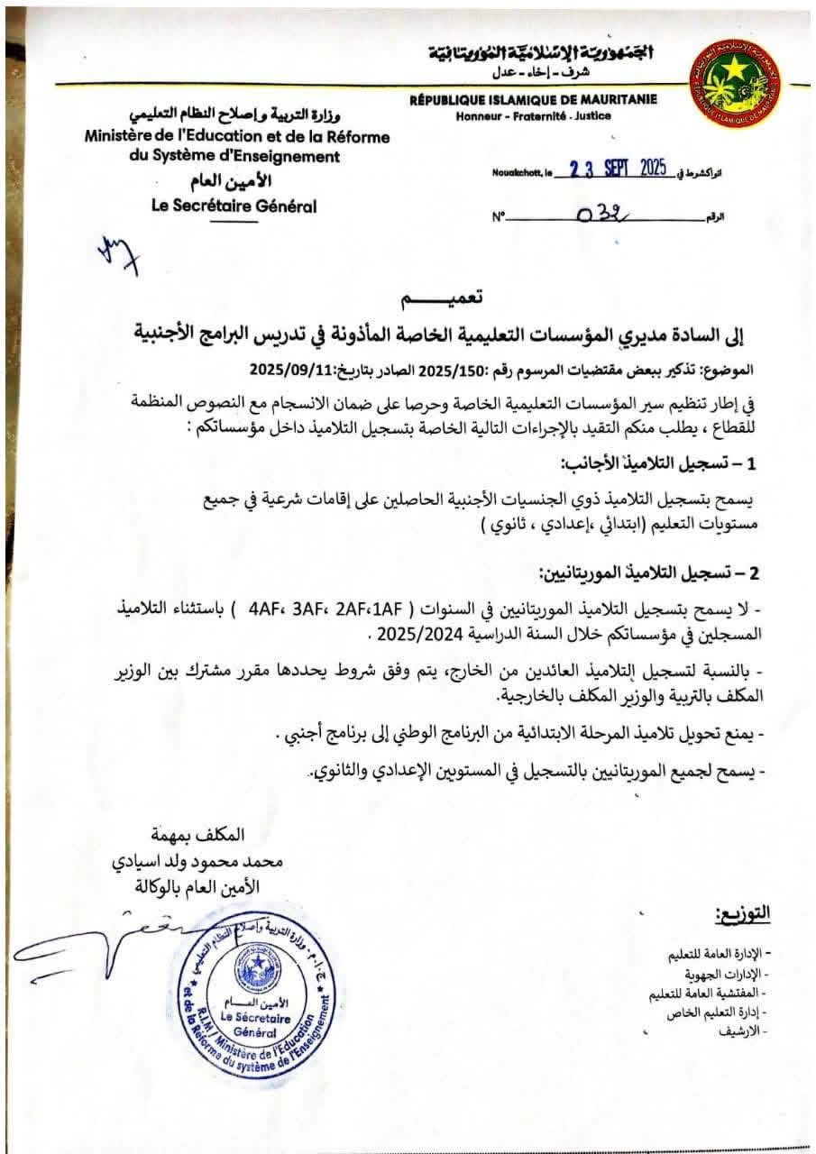 من المقرر أن يترأس رئيس الجمهورية، محمد ولد الشيخ الغزواني، صباح غدٍ الأربعاء، الموافق 1 أكتوبر 2025، عند الساعة العاشرة، الاجتماع الأسبوعي لمجلس الوزراء بالقصر الرئاسي في نواكشوط.